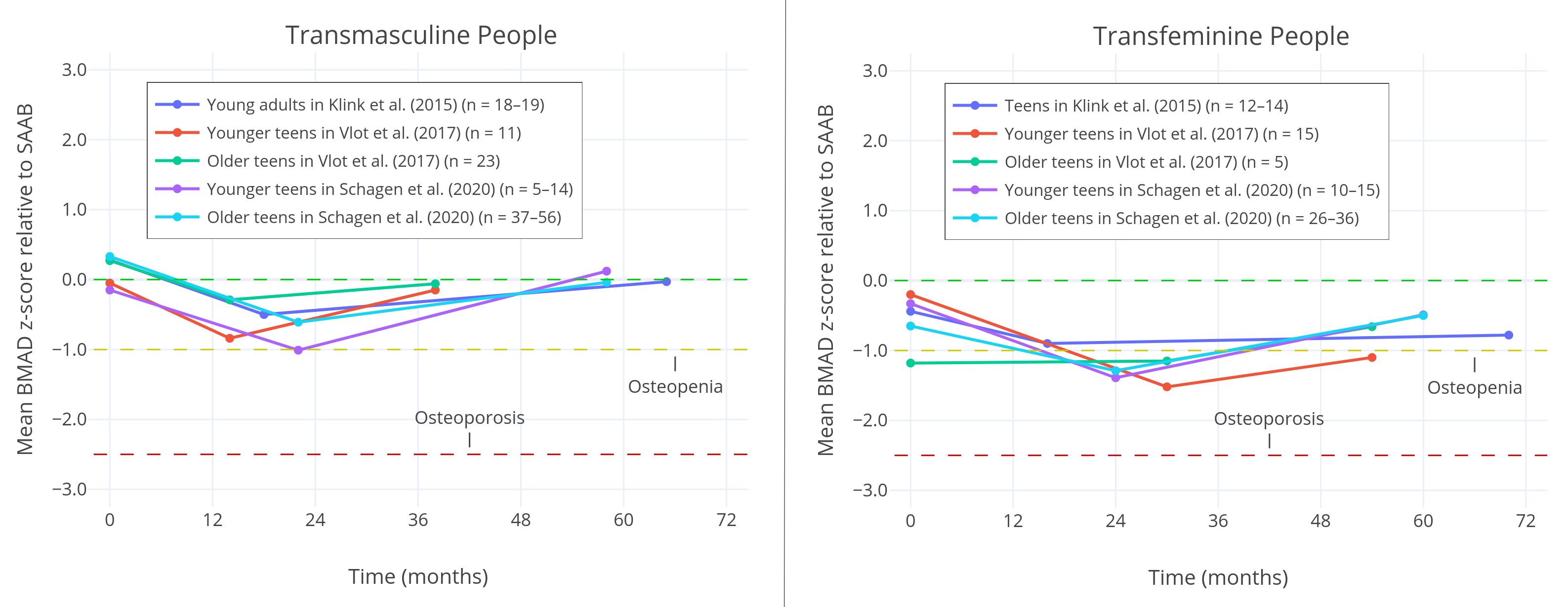 Klink et al. (2015) finds that in both trans girls and trans boys, z-scores are lower both before treatment, and after long-term follow-up. The study suggests a small negative effect on final bone density from the use of puberty blockers, although many measurements fail to reach statistical significance. The study records notably lower final z-scores for trans girls than trans boys.